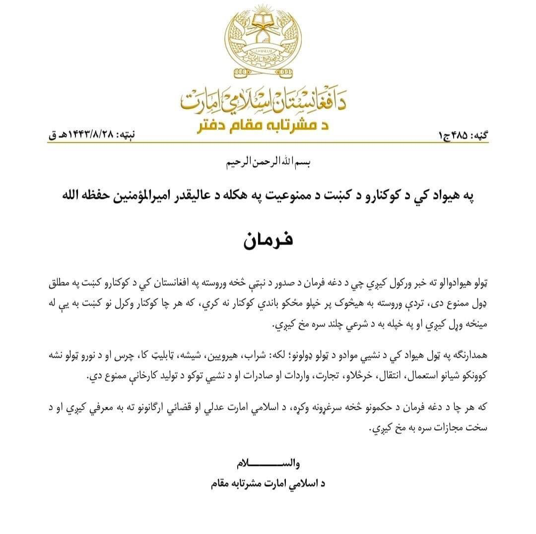 Taliban order ban on drug cultivation - Demand lifting of UN sanction from 21.12.2021 - so that licensed and certified CBD Novel Food - CBM and Medical THC cultivation - processing - transport - export can start with ECI